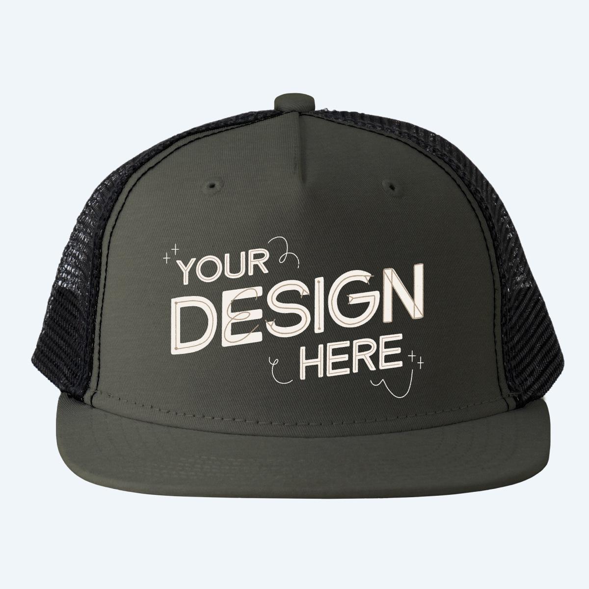 A 5-panel, flat bill trucker cap. This hat features a 100% cotton front panel and bill, 100% polyester mesh back panels, and a plastic snap closure.